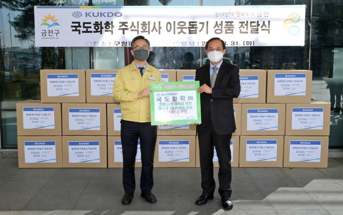 국도화학(주)이 지역내 취약계층을 위해 서울 금천구에 방역용 마스크 1만장(3300만원 상당)을 전달했다. 사진은 전달식에 참석한 유성훈 구청장(왼쪽) 및 문정기 국도화학(주) 경영전략본부장이 기념촬영을 하는 모습. (사진제공=금천구청)
