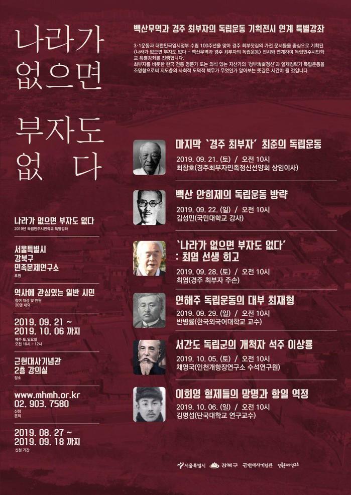 [시민일보 = 홍덕표 기자] 서울 강북구(구청장 박겸수)가 근현대사기념관과 함께 오는 21일부터 '2019 독립민주시민학교 특별강좌'를 운영한다.
