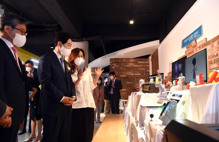 경기 의정부시는 6일 의정부공업고등학교·경민IT고등학교·신한대학교에서 창의교육 지원사업 센터의 개소식을 동시 개최했다. 시는 코로나19 언택트 환경 속에 교육 분야가 빠르게 적응해야만 미래가 있다는 판단 아래 센터를 개소했다. 사진은 개소식에서 안병용 시장(가운데)이 관계자들과 시설 라운딩을 하는 모습. (사진제공=의정부시청)
