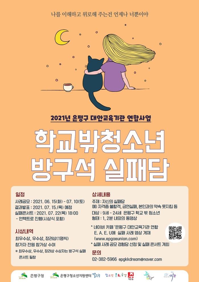 [시민일보 = 이대우 기자] 서울 은평구(구청장 김미경) 대안교육기관 연합이 학교 밖 청소년의 ‘실패’라는 주제로 하는 ‘방구석 실패담’ 영상공모전을 열고, 오는 10일까지 접수한다.