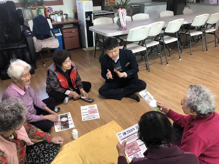 곽호영 신임 경기 여주시 금사면장은 최근 금사면 소재지 경로당 18곳을 방문해 신종 코로나바이러스 감염증 예방수칙 홍보 및 마스크를 전달하고 마을 주민들의 어려운 것을 청취하며 면정 운영을 시작했다. 사진은 곽 면장이 노인들과 이야기를 나누는 모습. (사진제공=여주시청)
