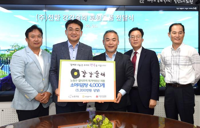 서울 노원구가 지난 1일 (주)전한 강강술래 상계점으로부터 지역내 홀몸노인들을 위한 소머리곰탕 4000개(3200만원 상당)를 전달 받았다. 이날 전달 받은 물품은 지역내 홀몸노인들에게 전달될 예정이다. 사진은 오승록 구청장(왼쪽 두 번째)과 관계자들이 기념촬영을 하는 모습. (사진제공=노원구청)