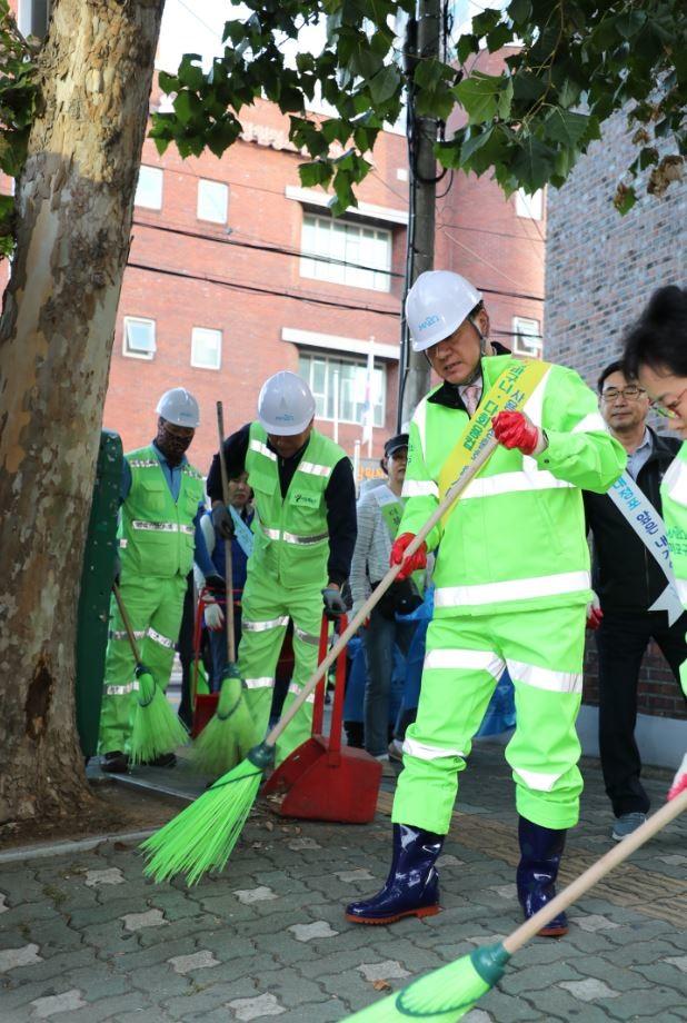 서울 마포구가 25일 구민체육센터와 서울월드컵경기장 일대에서 유동균 구청장을 비롯해 지역주민과 학생 등 약 400명이 참여한 가운데 '전국(장애인)체전 손님맞이 대청소'를 실시했다. 사진은 거리를 청소하고 있는 유 구청장의 모습. (사진제공=마포구청)