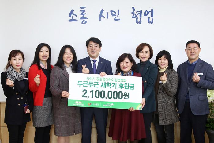 충남 서산시 공공형 어린이집연합회는 10일 초록우산 어린이재단에 새학기 준비에 어려움을 겪는 저소득가구 아동을 위한 지원금 210만원을 전달했다. 사진은 맹정호 시장(왼쪽에서 네 번째)과 관계자들이 기념촬영을 하는 모습. (사진제공=서산시청)