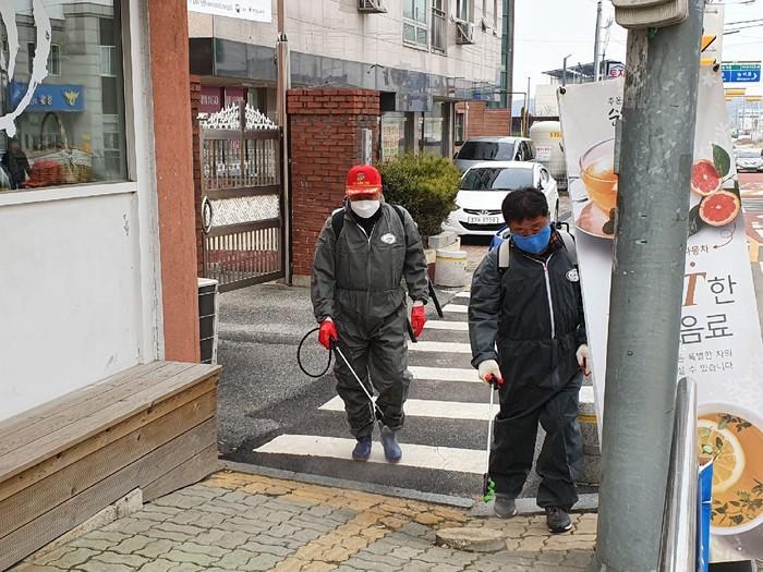 경기 여주시 능서면 행정복지센터서는 '능서면 구석구석 방역단'을 만들어 코로나19 방역활동을 하고 있다. 최근 형선 능서면이장협의회장과 이장 20여명이 방역활동에 참여해 질병관리본부의 집단시설·다중이용시설 소독안내에 따라 능서면 관공서, 소재지 상가지역, 세종대왕릉역, 여주보 등을 소독했다. 사진은 참여자들이 소독을 하는 모습. (사진제공=여주시청)