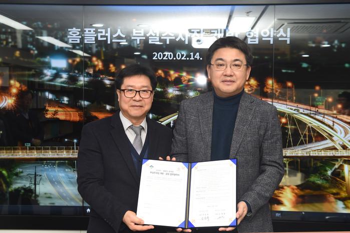 서울 노원구는 최근 구청장실에서 홈플러스 중계점과 함께 부설주차장 개방 협약을 체결했다. 협약에 따라 홈플러스 중계점은 오는 2022년 2월13일까지 주차면 30면을 개방한다. 사진은 오승록 구청장(오른쪽)과 관계자가 기념촬영을 하는 모습. (사진제공=노원구청)