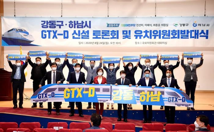 [하남=전용원 기자] 경기 하남시는 24일 국회의원회관 대회의실에서 열린 ‘하남시·강동구 GTX-D 신설 토론회 및 유치위원회 발대식’에서 서울 강동구와 GTX(수도권광역급행철도) D 노선 유치를 위한 협력 및 공동추진을 약속하는 결의문을 발표했다.