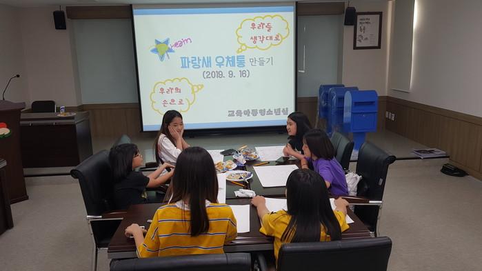 인천 동구는 16일 구청 소회의실에서 아동전용 의견함인 파랑새우체통의 디자인을 아동이 스스로 꾸미는 ‘파랑새우체통 구상교실’을 운영했다. 파랑새우체통은 지역내 3개교에 시범 설치될 예정이다. 사진은 아동들이 의견을 나누는 모습. (사진제공=동구청)