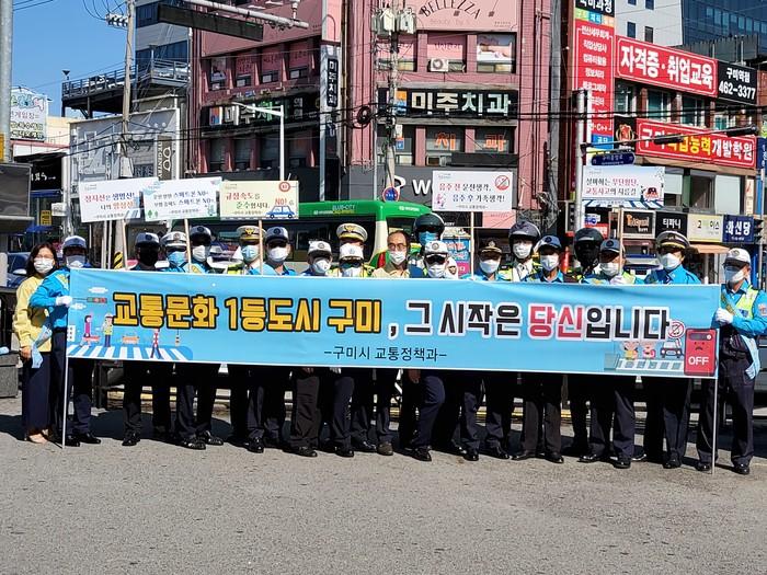 경북 구미시가 14일 구미역 광장에서 시 교통정책과, 모범운전자연합회, 경찰서 합동으로 교통문화지수 향상을 위한 '교통안전 릴레이 캠페인'을 열고 교통안전 캠페인 및 교통법규 위반에 대한 지도·단속을 동시에 펼쳤다. 사진은 이날 캠페인에 참여한 장세용 시장이 관계자들과 기념촬영을 하는 모습. (사진제공=구미시청)