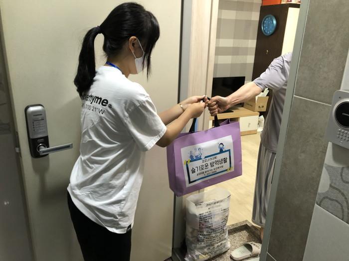 충남 아산시 온양5동은 최근 찾아가는 보건복지서비스의 일환으로 취약계층 30가구를 대상으로 코로나19극복! '슬기로운 방역생활' 사업을 추진, 집에서 쉽게 할 수 있는 컬러링북, 채소 키우기 키트와 함께 마스크 등 방역물품을 함께 전달했다. 사진은 대상 가구에 방역물품을 전달하고 있는 모습. (사진제공=아산시청)