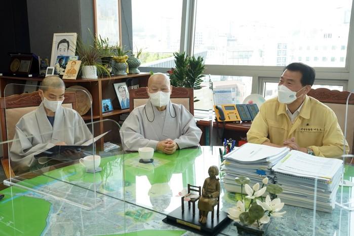 서울 성북구와 보문동 소재 보문사가 12일 구립 어르신 복지센터 설치·운영을 위해 업무협약을 체결했다. 센터는 오는 2024년 12월 개관 예정으로 어르신 쉼터 등 노인여가복지시설과 노인 일자리 지원기관 등이 입주할 예정이다. 사진은 이날 협약식에서 이승로 구청장(오른쪽)이 보문사 관계자들과 대화를 하고 있는 모습. (사진제공=성북구청)