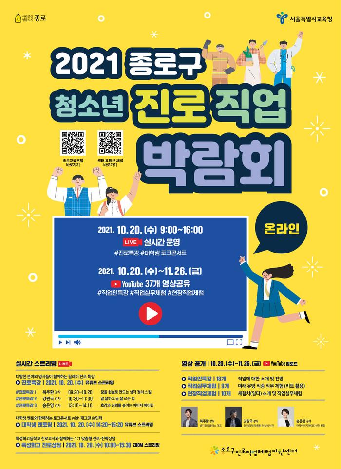 [시민일보 = 이대우 기자] 서울 종로구(구청장 김영종)가 오는 20일부터 ‘2021 종로구 청소년 진로직업박람회’를 온라인으로 개최한다.