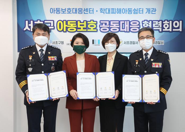 서울 서초구가 서초·방배경찰서, 계영복지재단과 최근 전국 최초로 아동학대 신고부터 사후관리까지 민·관·경이 원스톱으로 해결하는 ‘서초아동보호대응센터’에서 아동보호 공동대응 업무협약식을 개최했다. 사진은 협약식에서 조은희 구청장(왼쪽 두 번째)과 관계자들이 기념촬영을 하는 모습. (사진제공=서초구청)