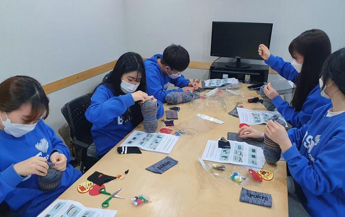 ▲ 해바라기 봉사단 4기 1조 단원들이 헌 양말으로 인형을 만들고 있는 모습. (사진제공=bhc치킨) |