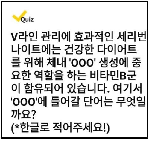 이날 캐시워크 돈버는퀴즈에서는 "V라인 관리에 효과적인 세리번나이트에는 건강한 다이어트를 위해 체내 '○○○' 생성에 중요한 역할을 하는 비타민B군이 함유돼 있습니다. 여기서 '○○○'에 들어갈 단어는 무엇일까요? 한글로 적어주세요"라는 문제가 나왔다.