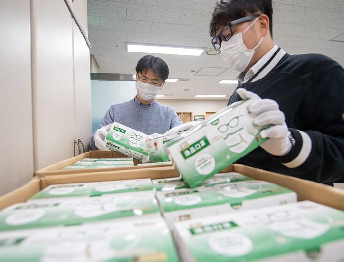용산구가 지난 9일 우호도시 중국 웨이하이시로부터 코로나19 예방을 위한 보건용 마스크 1만5000장과 함께 장하이보 시장의 친서를 전달 받았다. 사진은 이날 전달 받은 마스크를 검수하고 있는 구청 직원들의 모습. (사진제공=용산구청)