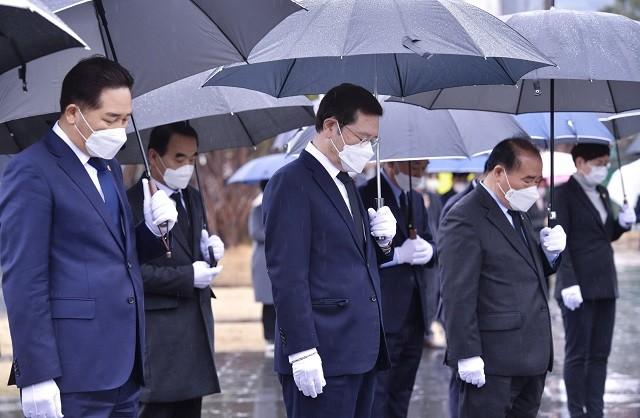 이용섭 광주광역시장이 제102주년 3‧1절을 맞아 1일 오전 서구 상무시민공원내 광주독립운동 기념탑을 찾아 이 자리에 함께한 김용집 광주시의회 의장, 장휘국 광주시교육감과 참배를 하고 있다.(사진제공=광주광역시)