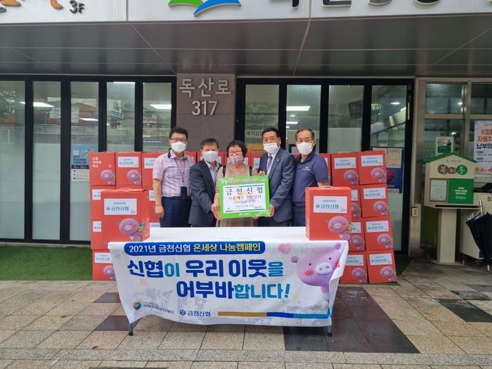 서울 금천구 독산3동 주민센터는 최근 지역 금융기관인 금천신용협동조합으로부터 지역의 어려운 이웃을 위한 즉석밥 등으로 구성된 식품세트 100상자(200만원 상당)를 전달받았다. 사진은 전달식에서 관계자들이 기념촬영을 하는 모습. (사진제공=금천구청)