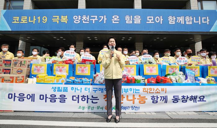 김수영 서울 양천구청장이 26일 오전 청사 건물 앞에서 열린 '마음 더하기 마음' 착한 소비 기증품 전달식에서 인사말을 하고 있다.