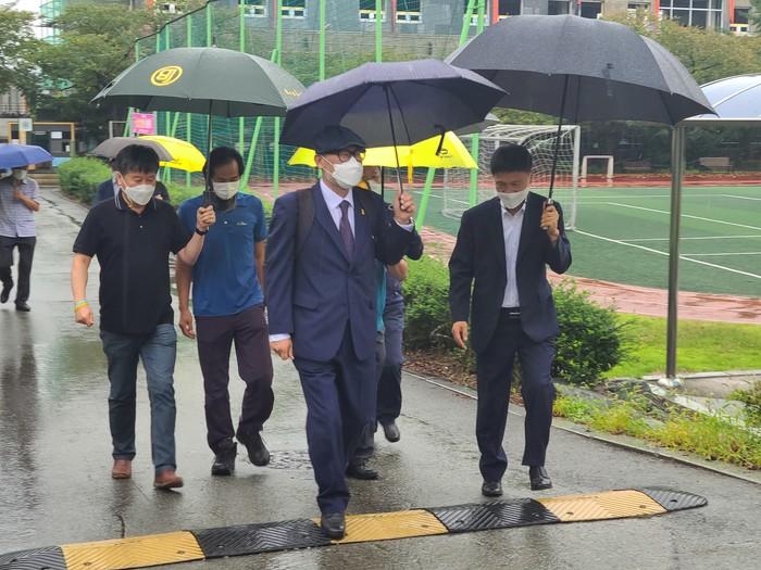 | ▲ 조창익 교사(가운데)가 복직 후 장성모 해남교육지원청 교육장(우측)과 함께 나란히 해남중학교로 출근을 하고 있다. / 해남교육지원청 제공 |