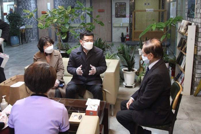 경기 수원시 팔달구는 최근 지역내 노인요양시설 등에서 코로나19 집단감염 사례가 발생함에 따라 1일부터 지역내 장기요양기관 29곳에 대한 현장점검을 확대 실시하고 있다. 사진은 1일 백운오 구청장이 행궁요양원을 방문해 관계자들과 대화하고 있는 모습. (사진제공=팔달구청)