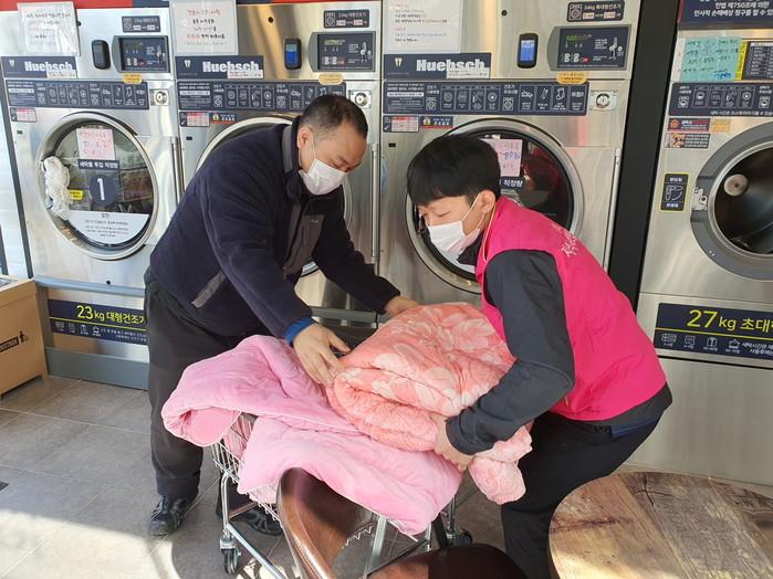 경기 수원시 권선구 세류3동 지역사회보장협의체는 23일 지역내 어려운 이웃을 돕는 '우리 동네 꿀단지 나눔터 사업'을 진행했다. 지역사회보장협의체 위원들은 이날 거동이 불편한 노인 등 4가구를 방문해 이불을 수거한 후 세탁이 끝난 이불을 집으로 배달했다. 사진은 협의체 위원들이 세탁이 끝난 이불을 나르고 있는 모습. (사진제공=권선구청)
