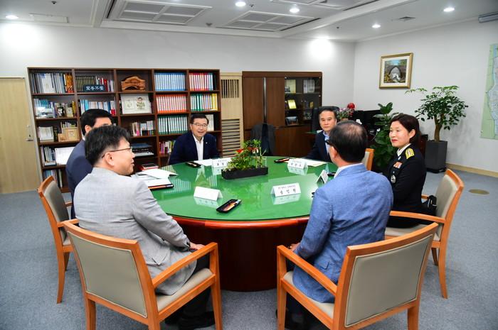 중랑구는 최근 구청에서 ‘중랑길 재생 프로젝트’의 원활한 추진을 위해 유관기관과의 업무협약(MOU)을 체결했다. 사진은 류경기 구청장(가운데)이 MOU 체결식에 참석한 유관기관 단체장과 중랑길 재생에 관한 이야기를 나누고 있는 모습. (사진제공=중랑구청)