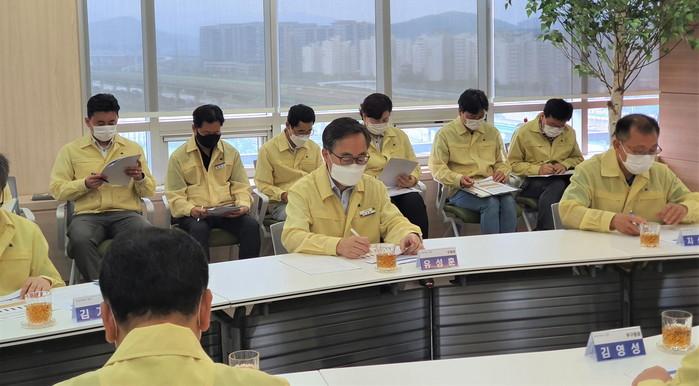 서울 금천구가 최근 구청 소회의실에서 ‘코로나19 긴급방역대책 회의’를 개최했다. 유성훈 구청장은 이날 긴급회의에서 관계 부서장에게 공공시설과 민간시설에 대한 방역조치와 사회적 거리두기 2단계 격상에 따른 대주민 홍보를 강화해 줄 것을 지시했다. 사진은 유 구청장(가운데)이 발언하는 모습. (사진제공=금천구청)