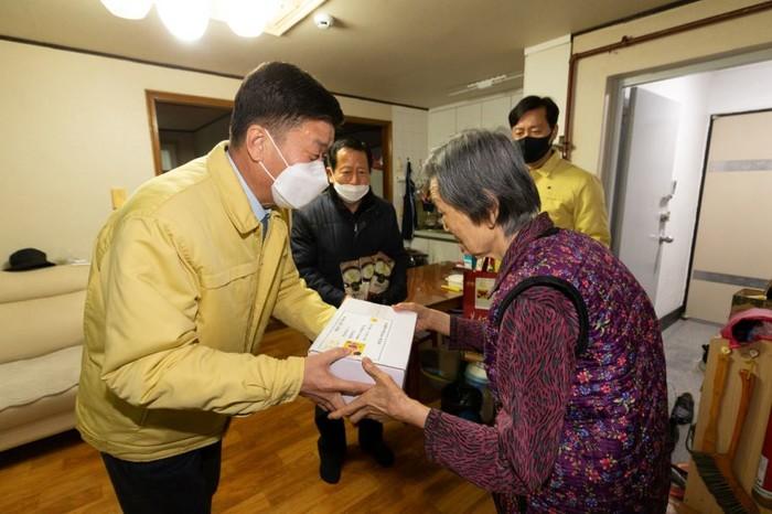 서울 은평구 응암1동 지역사회보장협의체는 최근 설날을 앞두고 홀몸노인 등을 위해 지역사회보장협의체 위원들이 회비와 찬조금으로 마련한 떡국떡과 사골곰탕 등 ‘설맞이 온정 꾸러미’를 직접 취약계층 20가정에 방문해 전달했다. 사진은 동 관계자들이 노인가구를 방문해 꾸러미를 전달하고 있는 모습. (사진제공=은평구청)