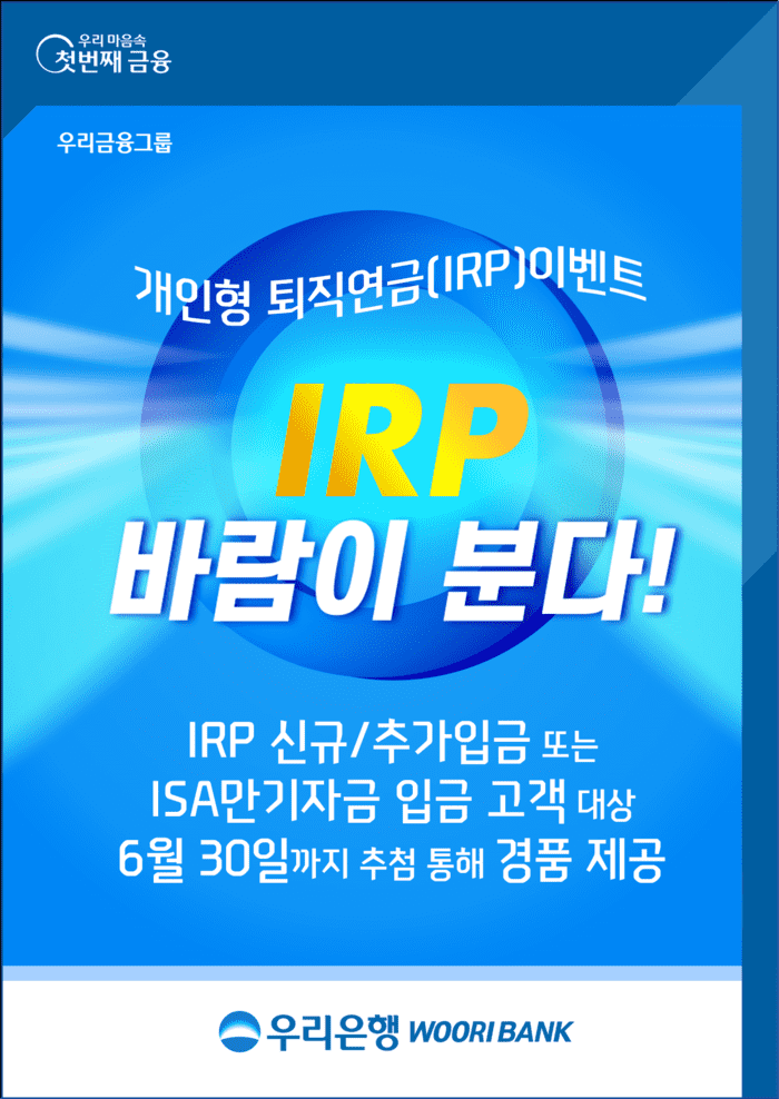 [시민일보 = 홍덕표 기자] 우리금융지주의 자회사 우리은행은 개인형 퇴직연금(IRP) 신규 및 추가 입금, ISA 만기자금 입금 고객을 대상으로 'IRP 바람이 분다' 이벤트를 오는 6월30일까지 진행한다고 6일 밝혔다.