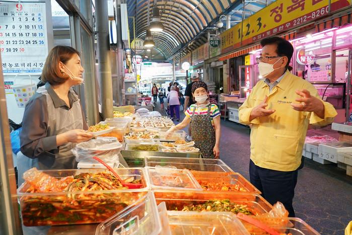 동대문구는 추석 명절을 맞아 오는 28일까지 지역내 전통시장의 특별 방역상황을 살피며 차례용품 물가 점검에 나선다. 사진은 유덕열 구청장(오른쪽)이 최근 전농로터리시장에서 한 상인과 이야기를 나누고 있는 모습. (사진제공=동대문구청)