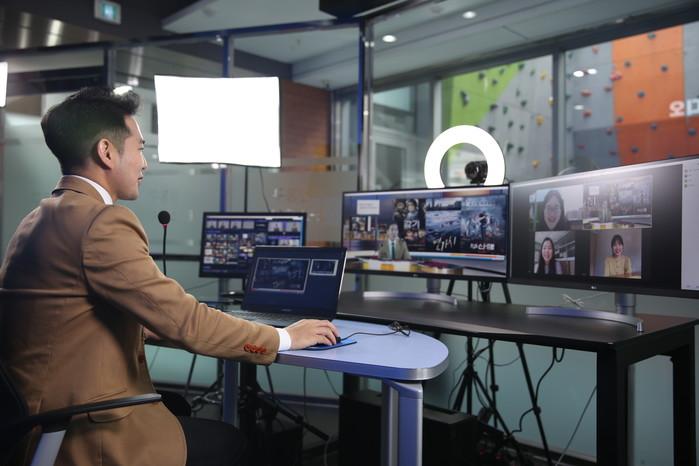 | ▲ 지난해 4월 개관한 강동 e-스튜디오에서 한 고등학교 교사가 학생들과 실시간 쌍방향 수업을 하고 있다 .(사진제공=강동구청) |