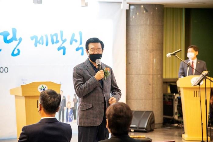 서울 용산구가 27일 용산아트홀 대극장 앞 로비에서 구민대상 수상자에 대한 예우를 위해 만들어진 ‘명예의 전당’ 제막식을 열었다. 사진은 제막식에서 성장현 구청장이 축사를 하고 있는 모습. (사진제공=용산구청)
