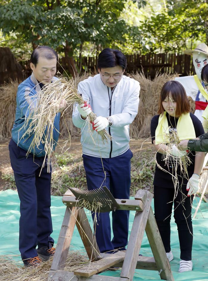 지난 11일 송파구가 방이동 생태학습관에서 '벼베기 행사'를 개최했다. 사진은 벼배기 행사에 참석한 박성수 구청장(가운데)이 참가자들과 함께 탈곡 체험을 하고 있다. (사진제공=송파구청)