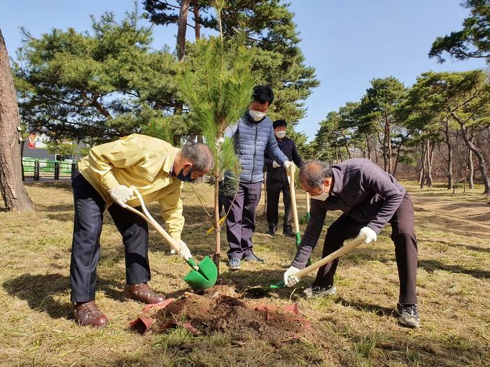 시에 따르면 이날 시 공직자와 시민단체 회원들이 이목동 767번지 일원에 심은 노송 후계목은 시가 2017년부터 고색동 양묘장에서 기른 것이다.