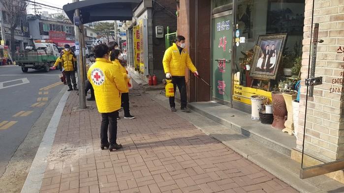 경기 양주시 광적면 적십자봉사회 회원 20명은 최근 코로나19 지역사회 확산 방지를 위해 지역내 버스정류장, 공공화장실, 가래비 5일장 등 지역내 다중이용시설을 대상으로 방역활동을 했다. 사진은 회원들이 방역작업을 하는 모습. (사진제공=양주시청)