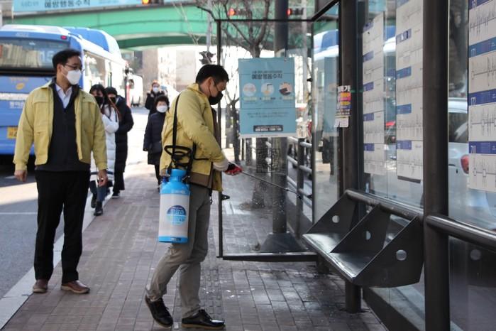 서울 성북구 모든 동주민센터 직원들이 신종 코로나바이러스 감염증 확산에 따라 최근 민원실, 회의실, 자치회관, 지하철역 등 지역 곳곳에서 자체 방역활동을 일제히 펼쳤다. 사진은 돈암1동 주민센터 직원들이 인근 버스정류장에서 방역작업을 하는 모습. (사진제공=성북구청)