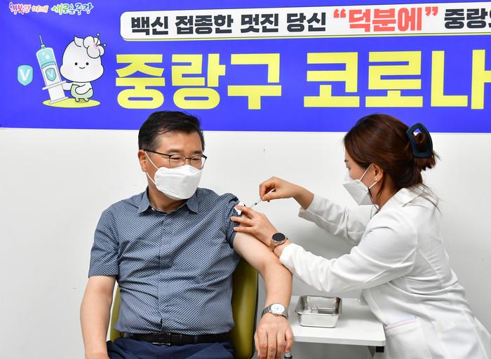 류경기 중랑구청장이 지난 11일 아스트라제네카(AZ) 2차 예방접종을 받았다. 이날 류 구청장은 접종 여부를 인증하는 예방접종증명서를 발급받았다. 사진은 류 구청장(왼쪽)이 AZ 2차 예방접종을 받고 있는 모습. (사진제공=중랑구청)