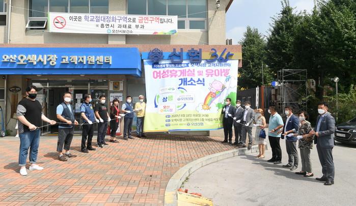 경기 오산신협과 오산 오색시장상인회는 18일 오산 오색시장 고객지원센터에서 '아가 사랑방' 현판 제막식을 열었다. 아가사랑방은 수유실과 휴식공간이 포함된 여성전용 쉼터로 오전 9시~오후 6시 운영한다. 사진은 곽상욱 시장(왼쪽에서 일곱 번째)이 현판제막식에 참여한 모습. (사진제공=오산시청)