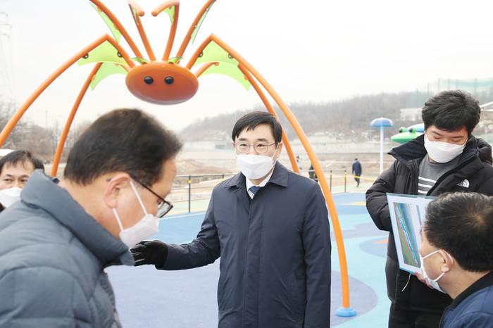 이동진 도봉구청장은 지난 15일 중랑천 녹천교 주변 노후시설 및 물놀이장·농구장 등의 시설물 설치·정비공사 현장 점검을 진행했다. 사진은 이 구청장(가운데)이 담당 직원들에게 중랑천 물놀이장 시설물 설치현황에 대해 보고받고 있는 모습. (사진제공=도봉구청)