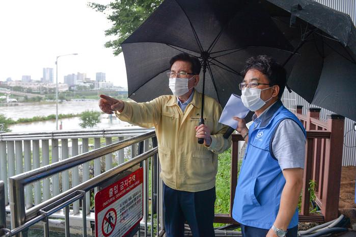 | ▲ 최근 내린 집중호우로 수위가 높아진 중랑천을 방문한 유덕열 구청장(왼쪽)이 관계자와 함께 주변을 점검하고 있다. (사진제공=동대문구청) |
