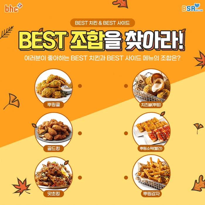 [시민일보 = 고수현 기자] 대한민국 대표 치킨 브랜드 bhc치킨이 BSR와 함께하는 '치킨과 사이드메뉴 Best 조합을 찾아라' 댓글 이벤트를 진행한다고 12일 밝혔다.