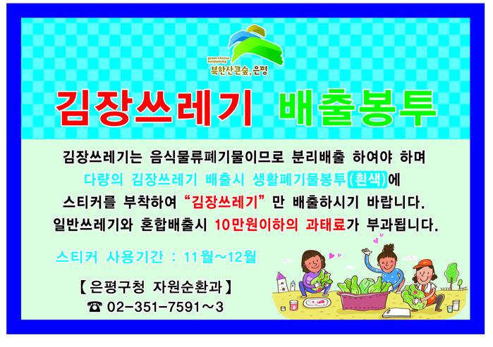 [시민일보 = 이대우 기자] 서울 은평구(구청장 김미경)가 오는 11월9일~12월31일 일반주택에서 배출되는 다량의 김장쓰레기를 생활폐기물 전용봉투에 담아 배출할 수 있도록 허용할 예정이라고 28일 밝혔다.