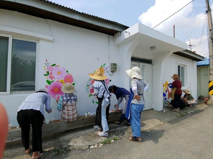 경기 이천시 신둔면 주민자치위원회는 최근 도암2리 마을회관 주변 노후화된 건물과 외벽에 벽화를 그리는 봉사를 했다. 이날 지역내 아크릴화반 학습자들의 재능기부를 통해 '마을회관 포토존'이 조성됐다. 사진은 벽화를 그리고 있는 모습. (사진제공=이천시청)