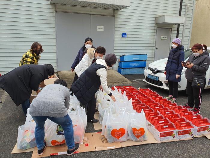 충남 아산시 온양5동 여성자원봉사단이 최근 지역내 저소득 취약계층 45가구에 기초푸드뱅크에서 지원받은 레드비트착즙 1상자(30포입)·즉석죽 등과 용화태권도에서 후원받은 라면으로 구성된 식생활 용품을 전달했다. 사진은 여성자원봉사단 단원들이 대상자들에게 전달할 물품을 준비하고 있는 모습. (사진제공=아산시청)