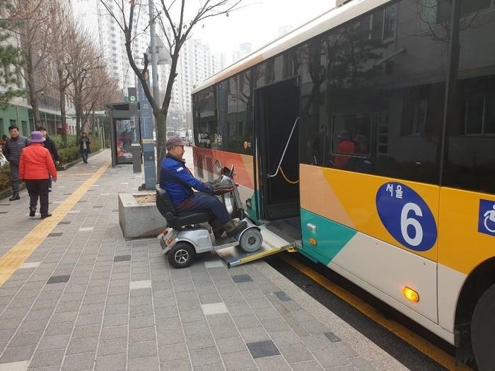 | ▲ 초저상 노약자 무료셔틀버스에 탑승하고 있는 장애인 모습. (사진제공=성동구청) |