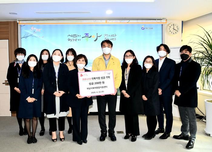 경기 하남시 육아종합지원센터는 22일 하남시청에 방문해 코로나19 여파로 어려움을 겪고 있는 이웃들을 위해 써달라며 성금 200만원을 기탁했다. 사진은 김상호 시장(오른쪽 다섯 번째)과 센터 임직원들이 함께 기념촬영을 하는 모습. (사진제공=하남시청)