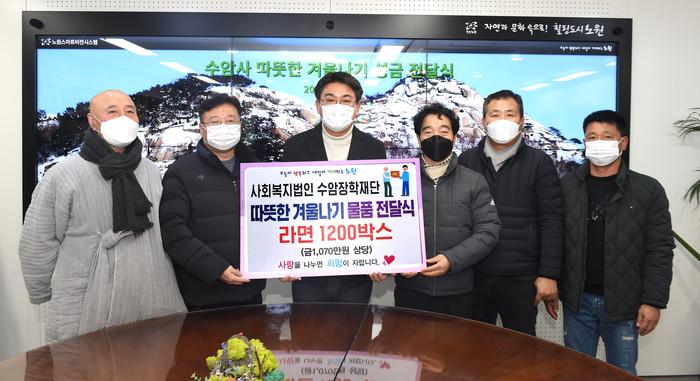 노원구는 지난 15일 사회복지법인 수암장학재단으로부터 소외계층을 위한 라면 1200상자(금 1070만원 상당)를 전달받았다. 사진은 따뜻한 겨울나기 물품 전달식에서 오승록 구청장(왼쪽에서 세 번째)과 관계자들이 기념촬영을 하는 모습. (사진제공=노원구청)