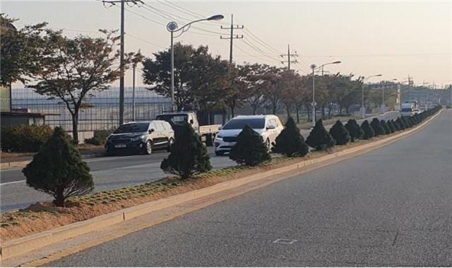 | ▲ 해남군이 도로환경 개선을 위해 주요 도로의 중앙로와 도로변에 꽃나무 등을 식재해 도로 이미지를 바꿔나가고 있다. / 사진은 해남-완도간 4차선 도로 중앙에 식재된 코니카가문비 나무 / 해남군 제공 |