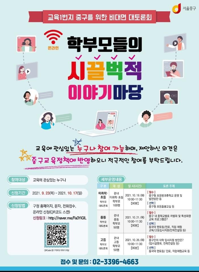 [시민일보 = 여영준 기자] 서울 중구(구청장 서양호)는 구의 교육 현실에 대해 학부모들과 의견을 나누기 위한 대토론회 '학부모들의 시끌벅적 이야기마당'을 개최한다고 29일 밝혔다.